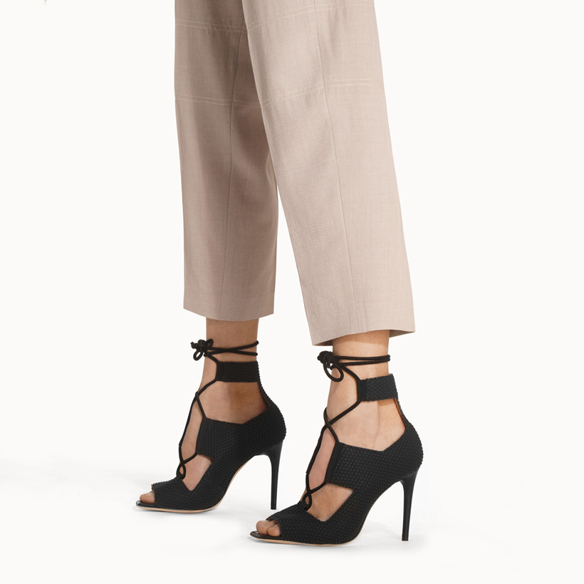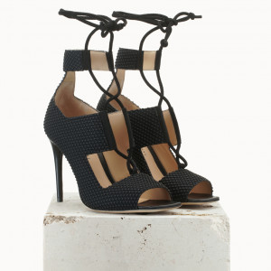 «Une sandale aux deux visages,l’un ultra moderne avec des découpes saillantes comme point d’honneur à la silhouette et l’autre celui de l’ultra feminin grâce au laçages et aux passant en satin gros grai» Estelle Morelli