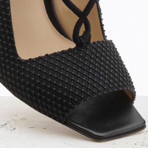 Il materiale principale della scarpa è il cotone naturale, sul quale sono state applicate piccole perle di materiale tecnico. Il risultato è l’effetto di una rete ad intreccio geometrico.